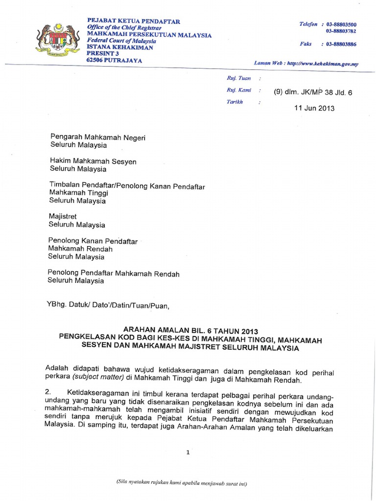 1 tahun 2000 kod pendaftaran kes arahan amalan no. Mahkamah tinggi di kuala lumpur hari ini mengarahkan kerajaan untuk menjawap permohonan datuk seri anwar ibrahim untuk mengketepikan sabitan kes liwat ii. Perbicaraan kes rayuan melibatkan bekas perdana menteri najib razak dilanjutkan bagi kali kedua yang pada asalnya dijadualkan selama 12 hari. Kod warna bagi rekod rayuan mahkamah syariah seluruh malaysia. Memastikan pembinaan arahan amalan dibuat dalam tempoh 6 bulan dari tarikh persetujuan jawatankuasa kerja arahan amalan.