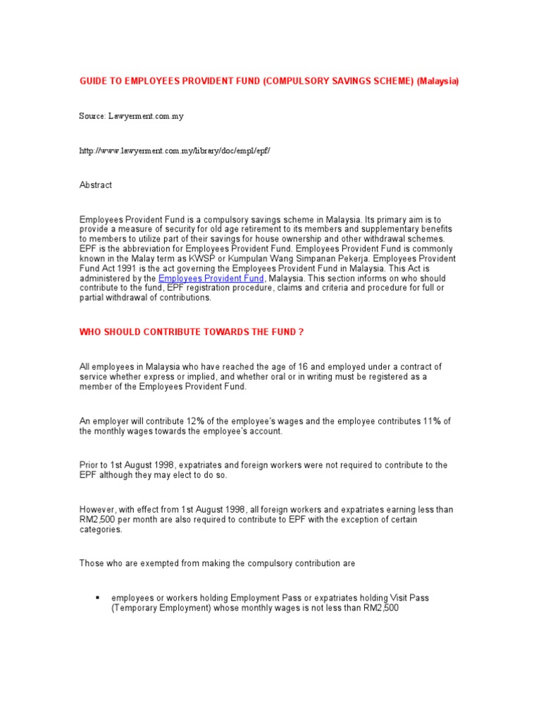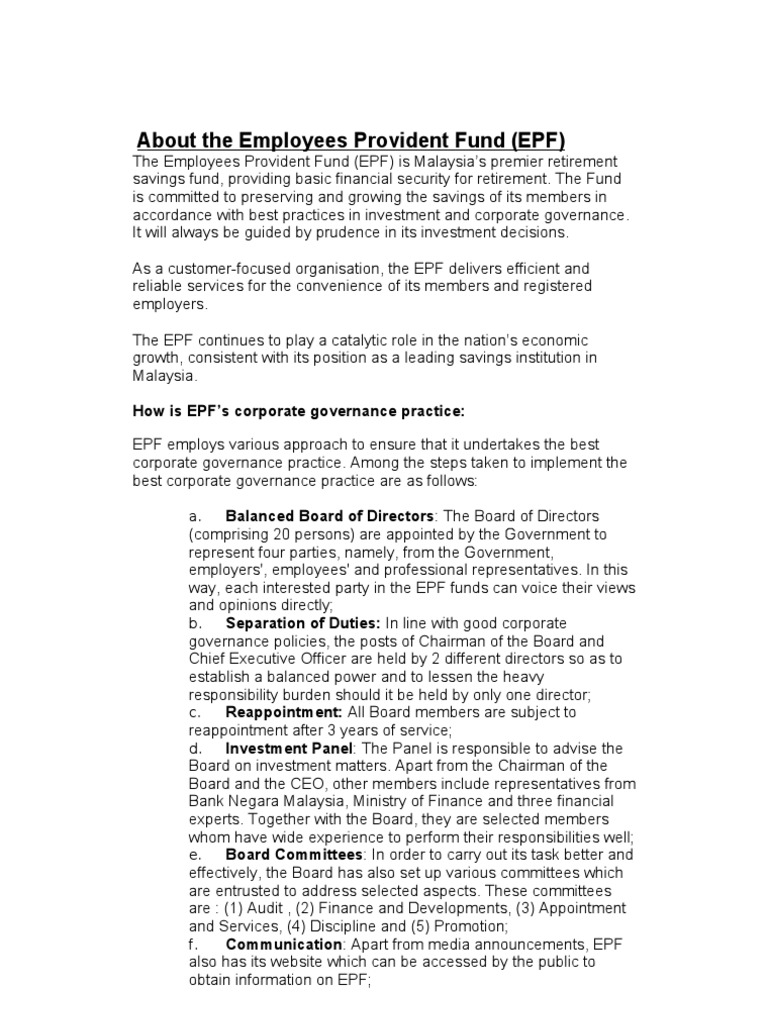 The employees provident fund (epf) is one of the world's oldest provident funds. We also briefly discuss and compare epf schemes in four commonwealth countries. Employee provident fund (epf) is to ensure employees in the private sector are financially secure after retirement, hence a scheme of compulsory contribution and saving was enforced by the government. We explain about defined contribution and defined benefit pension funds and examine their similarities and differences. Governed under the employee provident fund act 1991, epf is a retirement saving scheme for employees who are liable to contribute epf in malaysia in which the savings contributed will be managed and invested under simpanan.