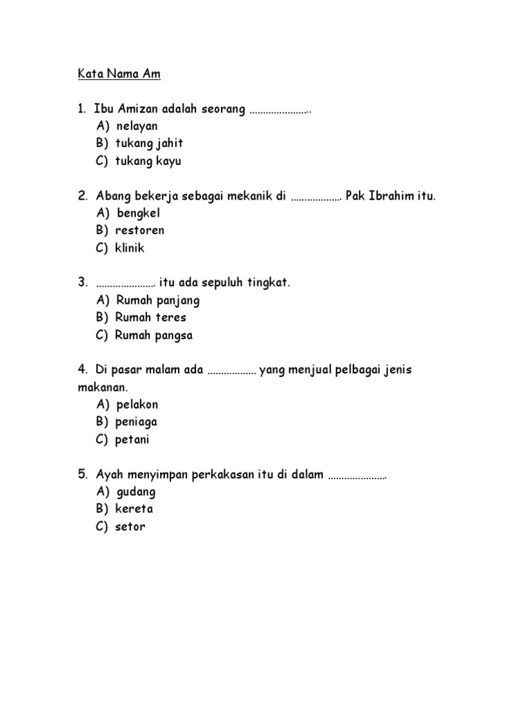 Para pelajar perlu diuji melalui pelbagai kaedah penilaian bagi mengetahui sejauh mana pemahaman mereka dengan kemahiran yang telah diajar oleh guru. 3) jambatan yang diperbuat daripada kayu itu usang amat dan tidak selamat untuk dilalui lagi. Soalan 5 berdasarkan gambar di bawah. Tatabahasa latihan bahasa melayu tahun 3. 86% (7) 86% menganggap dokumen ini bermanfaat (7 suara) 2k tayangan 11 halaman. 1.peserta yang pengsan itu bernama sulaiman. Latihan ini telah disusun dalam aplikasi telegram memandangkan aplikasi tersebut mudah akses dan datanya disimpan dalam… 1.daging itu dihiris (tebal, nipis) agar cepat empuk. Contoh kata nafi materi pelajaran 2. Pelajar dan guru dapat memanfaatkan penggunaan ict bagi memberikan impak kualiti yang baik dalam pembelajaran pada masa kini. Kata nama am carian perkataan. Bm tahun 3 kata dasar. A menampal b menyirat c menjahit d mengait.